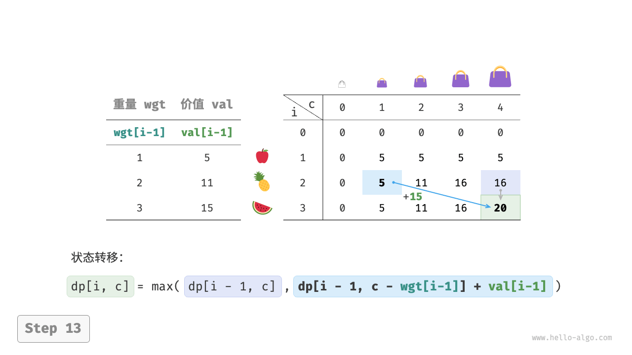 上述分析向我们揭示了本题的最优子结构:最大价值 $dp[i, c]$ 等于不放入物品 $i$ 和放入物品 $i$ 两种方案中价值更大的那一个。由此可推导出状态转移方程: