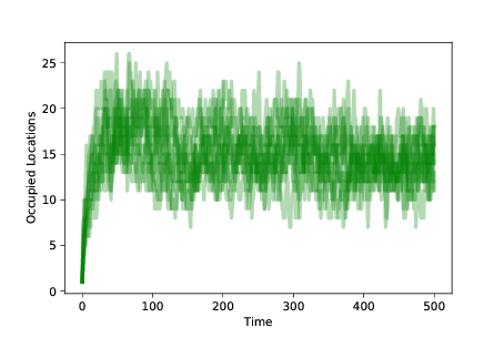 为了测量种群的多样性,我们可以绘制每个时间步后占用位置的数量。 图?展示了结果。 我们以同一地点的 100 个智能体开始。 随着突变的发生,占用位置的数量迅速增加。